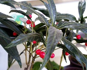 紅い実がたくさん成って千両、万両とならんで中国名は「百両金」。江戸時代には斑入りなども登場し、人気を集めたそうです。山歩きで日に照り映える紅い実を見つけた時、何だかリッチな気分になりませんか。