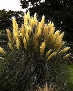 パンパスとは「草原、平原」のこと。自生地の南米で茂っている姿を想像すると雄大です。銀白色の大きなふわふわした花穂は、ドライフラワーとしても人気があります。和名は「白銀葦」(しろがねよし)といいます。